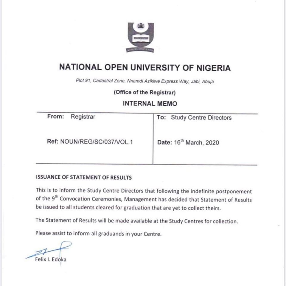 The National Open University of Nigeria (NOUN) wishes to inform the general public, especially our over 25,000 graduating students, that the 9th Convocation Ceremonies, scheduled for March 20 and 21, 2020 have been postponed indefinitely.